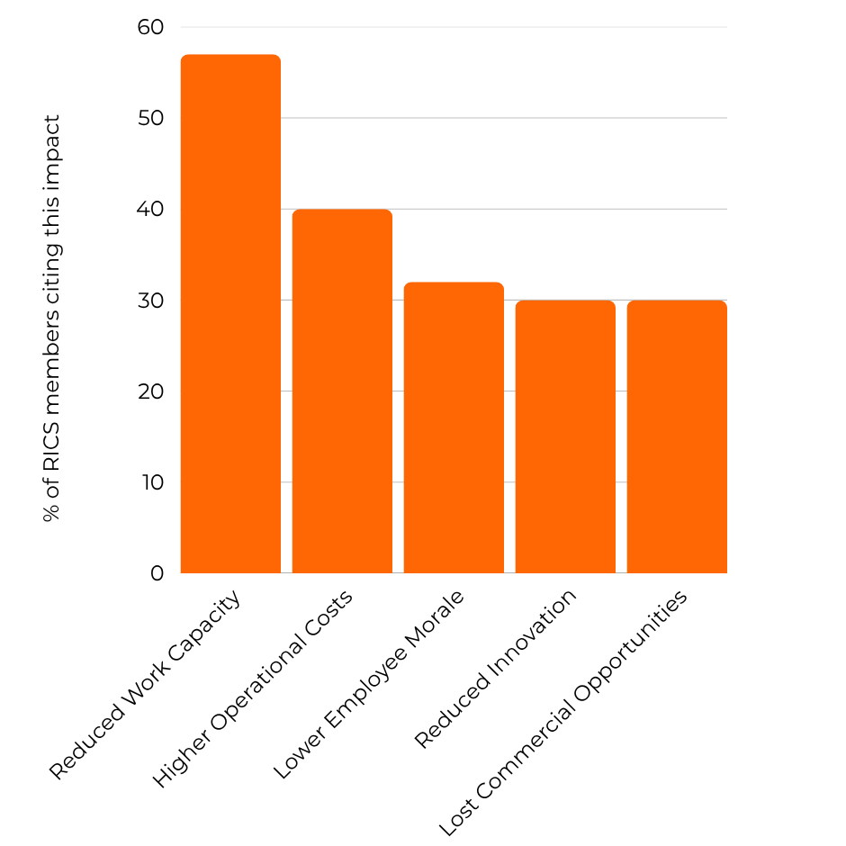 The RICS report identifies that 32% cite lower employee morale as an impact of skills shortages. This can be often driven by overwork and burnout.